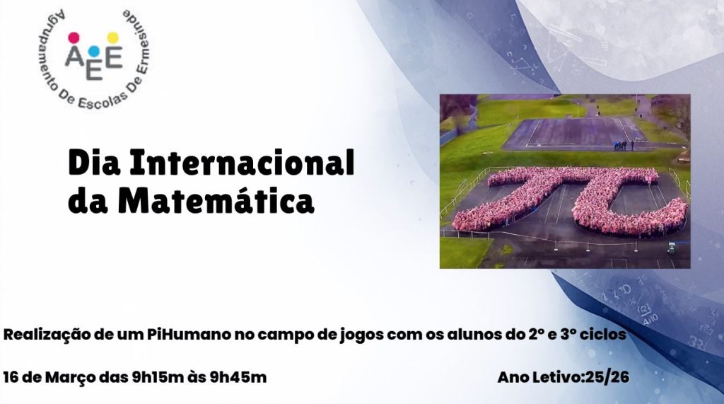 Dia Internacional da Matemática recebeu reconhecimento oficial em 2019, quando a UNESCO aprovou a proposta da International Mathematical Union (IMU) para criar uma celebração global da Matemática. A data escolhida foi 14 de março, já conhecida como Pi Day em referência ao número π (3,14). A iniciativa surgiu do desejo de destacar o papel central da matemática no desenvolvimento científico, tecnológico e social. A partir de 2020, a data passou a ser comemorada oficialmente em diversos países, com atividades educativas, eventos culturais, desafios, exposições e palestras. O nosso Agrupamento irá festejar este dia a 16 de março com a realização de uma atividade no campo de jogos “PiHumano”.