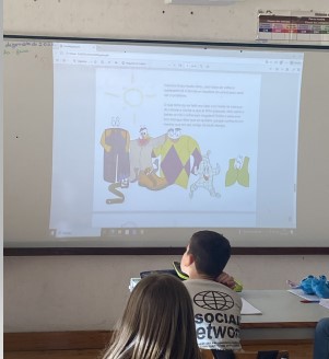 Seguidamente, os alunos visualizaram um vídeo explicativo sobre o ciclo de vida da roupa — desde a sua compra no comércio até ao processo de recolha, triagem e valorização final. O recurso audiovisual contribuiu para o desenvolvimento da atenção, da perceção visual e do vocabulário específico do tema, reforçando a importância das práticas de reutilização e reciclagem.