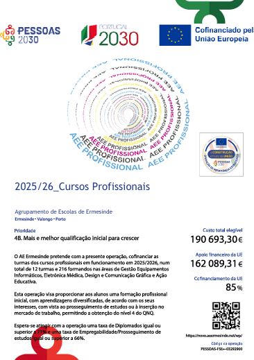 | A pré-inscrição (formulário de pré-inscrição)destina-se, exclusivamente, a alunos que pretendam matricular-se no ensino profissional, na Escola Secundária de Ermesinde. Esta pré-inscrição não dispensa as formalidades obrigatórias que ocorrerão no final do presente ano letivo. (Portal das Matrículas) Oferta Formativa Curso Profissional Técnico/a Eletrónica e Comunicações Curso Profissional Técnico/a de Design de Comunicação Gráfica Curso Profissional Técnico/a Ação Educativa Curso Profissional Técnico/a de Sistemas de Computação e Redes |